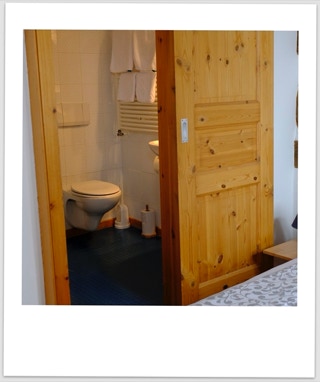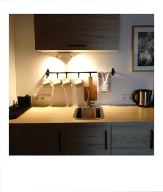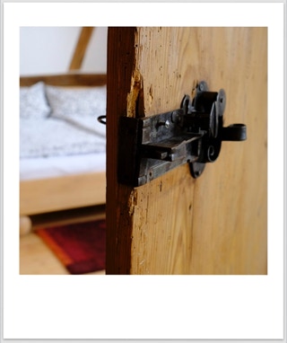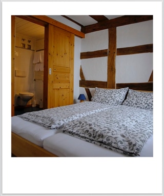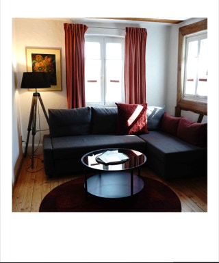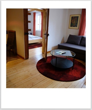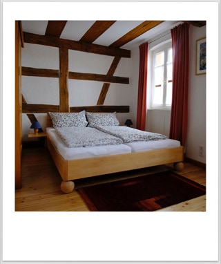 Unsere Wohnung Nr. 2 liegt im ersten Stock. Sie ist baugleich wie Wohnung Nr 1., hat ein Wohnzimmer mit Essecke und Küchenzeile, ein Schlafzimmer und ein Bad mit Dusche und WC. Auch hier sind der Dielenboden, freigelegtes Fachwerk und Holzpanele prägend für den Charakter der Wohnung. Es gibt eine Küchenzeile mit Zweiplattenherd und Grundausstattung fürs Kochen. Das Sofa im Wohnzimmer ist ausziehbar.